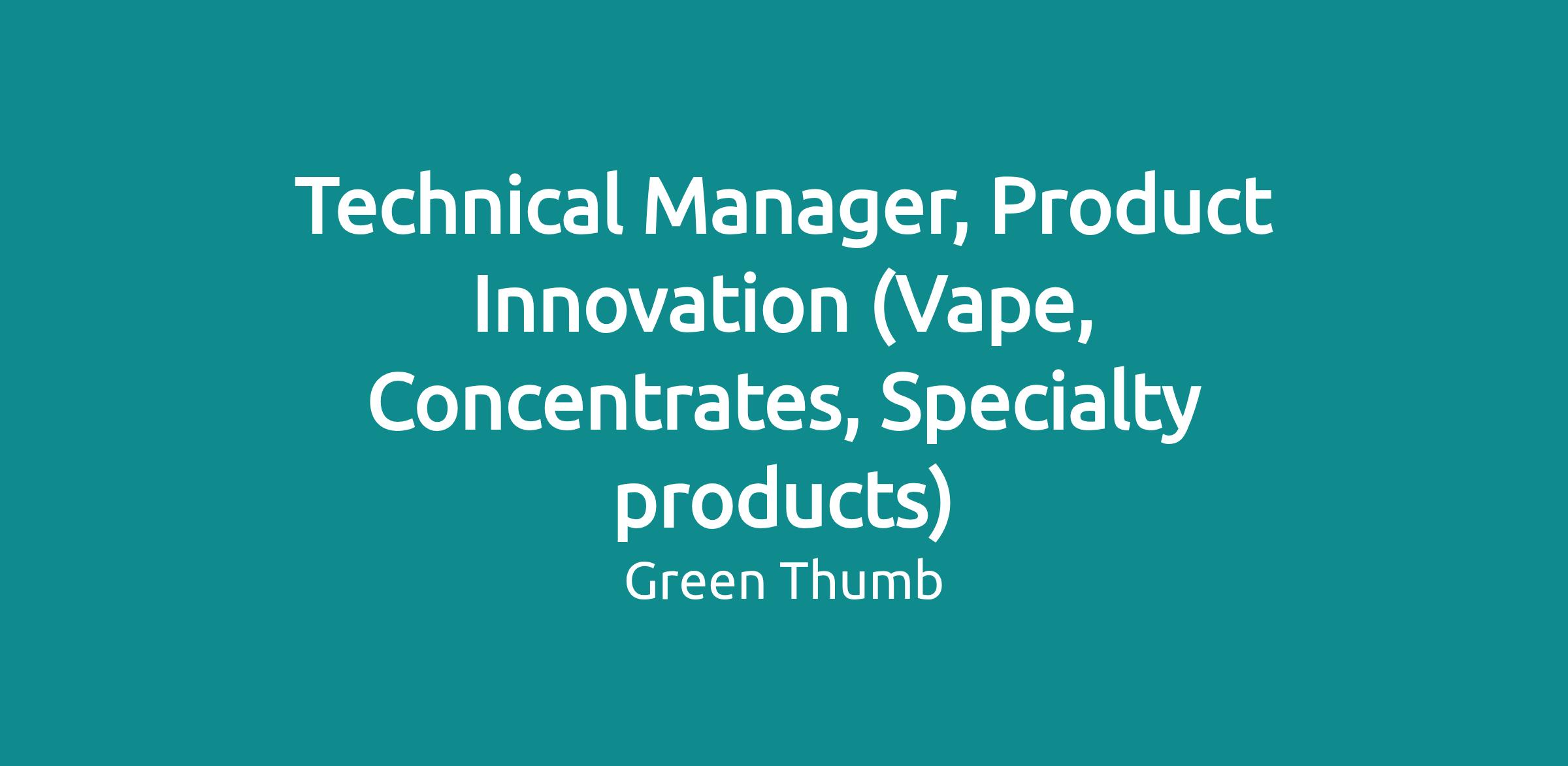 At Green Thumb, continuous innovation is a key focus area as we seek to create the best product experiences for our consumers. As the Technical Manager, Product Innovation – Vape, Concentrates, Specialty products you will play a critical role in bringing our innovation strategy to life within our vape and concentrates categories. You’ll bring bold, new-to-world concepts from idea to launch and support your team to drive the expansion of existing product lines across markets. This role requires strong project and people management skills, collaborative execution, a continuous improvement mindset, and strong technical knowledge of extraction methods, oil specifications, and vape hardware components, as we seek to deliver products that both delight our consumers and strengthen our market position.